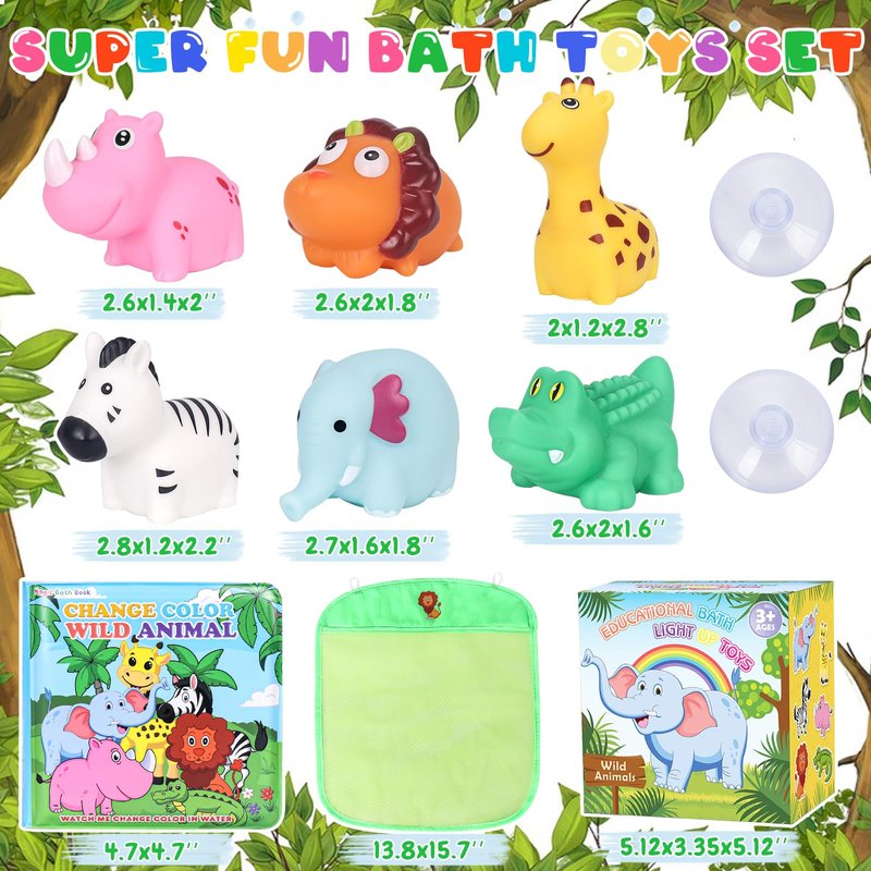 - 8 PCS Wild Zoo Animals Bath Toys for Toddlers -- Includes LED light up bathtub toy animals * 6, color-changing animals bath book * 1, mesh bag tub toys organizer * 1. This bath tub water toys set is for toddlers, kids, babies, infants, boys, girls age 1 2 3 4 5 6 7 8 +, especially for animals lovers. Super cool light up bathroom toys for toddlers, bath tub toys, shower toys, also double as kids pool toys