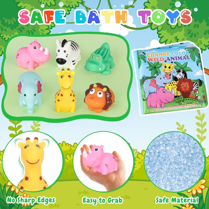 - 100% Safe & Sealed Bath Time Toys -- All the sensory bath toys are sealed without holes, no water spraying. Both the bath toys and bath book are made of premium materials, non-toxic and BPA free for babies over 6 months old. Also no sharp edges, and not easy to break or tear. The size of this animals bathtub toys set is easy for little toddlers to grab too. All designs are 100% friendly to kids, because safety always comes first. Safe baby bath time toys for toddlers 1-3 4-8