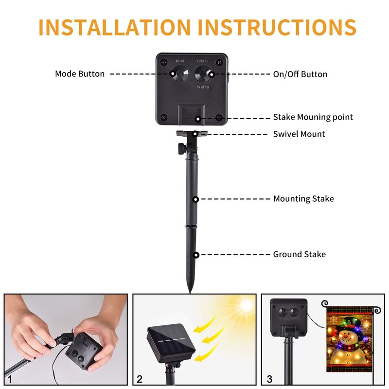 - [UNIQUE DESIGN]: Winter snowman garden flag is equipped with solar lights and solar panel. The light automatically turns on at dusk, and off to charge during the daytime as long as the solar panel is exposed to the sunlight. (Note: the flagpole not included.)