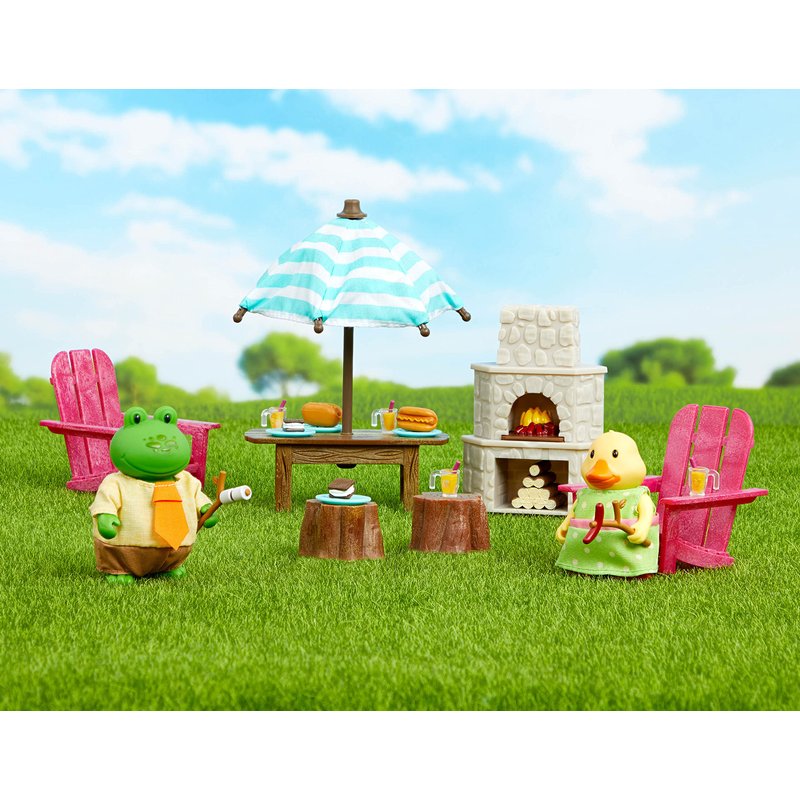 - Includes: 25-piece playset includes 2 animal figurines, a fireplace, a table, 2 chairs, 2 roasting sticks, an umbrella, and more!