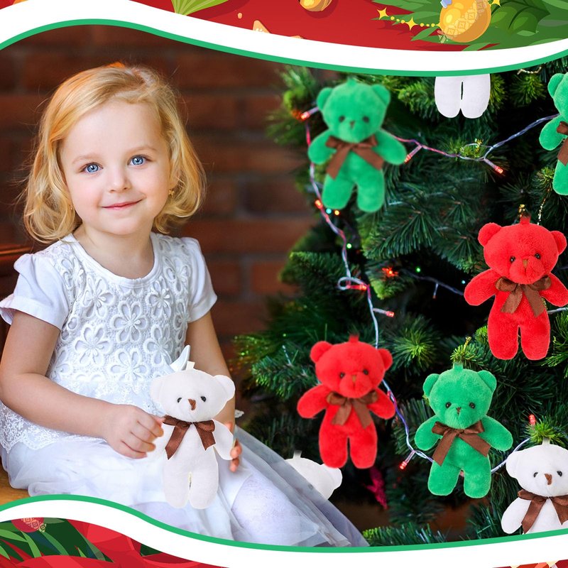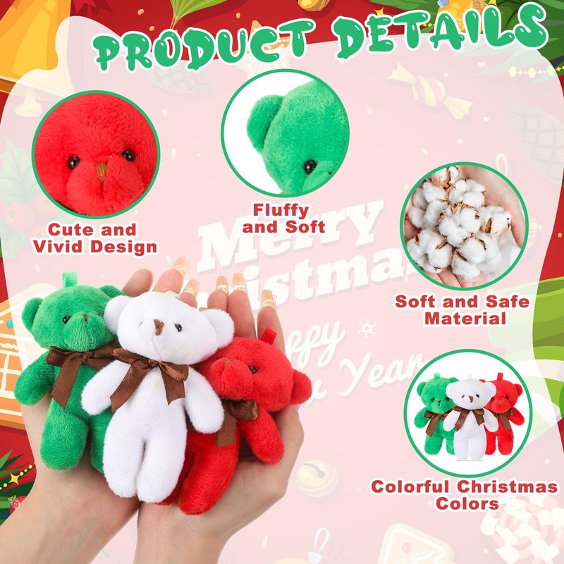 Features: Whether strung up on a Christmas tree, placed on a mantelpiece, or adorned in a child's room, these tiny stuffed bears will add a touch of Christmas cheer. These Christmas plush bears will not only enhance your holiday ambiance but also spread Christmas cheers with their adorable appearance. Specifications: Material: plushColor: red, green, whiteSize: about 4.5 x 3.5 inches/ 11.5 x 9 cmPackage includes: 24 x Christmas stuffed bearsNotes: Manual measurement, please allow slight errors on size. The color may exist a slight difference due to different screen displays. The stuffed animal is vacuum packed, so there will be a little deformation and wrinkle after opening the package, but if you pat it and disperse the filling, it will slowly return to its original shape.