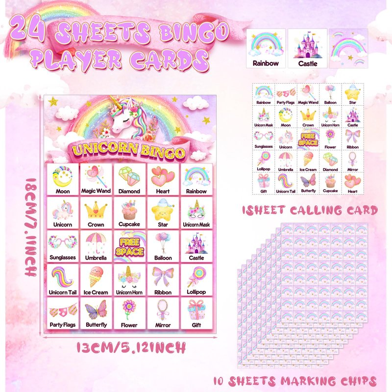 - Unicorn Bingo Game Set: you will receive 24 bingo player cards (24 different patterns per card), 10 marking cards (56 pieces of chips per card), and 1 calling chip; It supports enough people to play together; Engage with your family and friend in this exhilarating party game and create unforgettable memories together