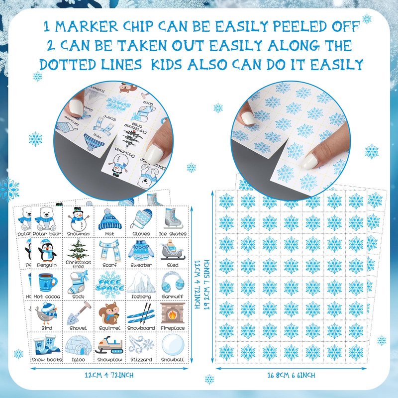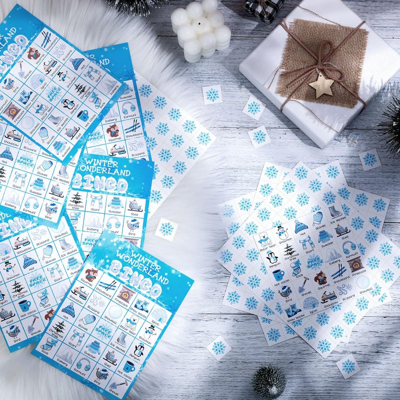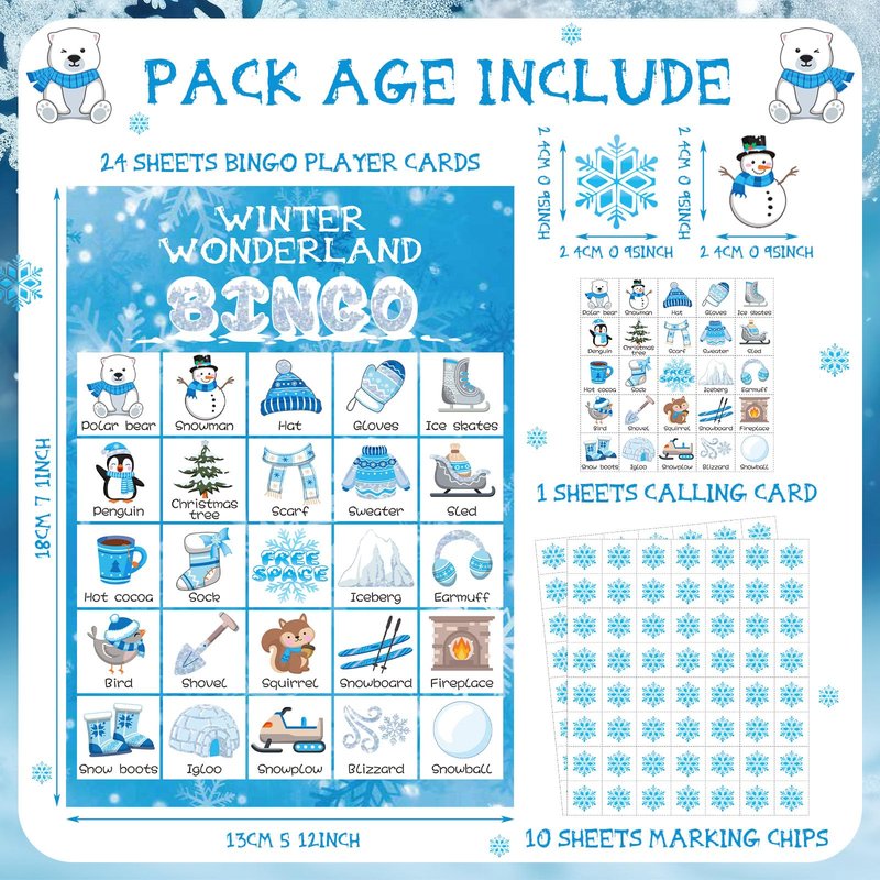 - Winter Bingo Game Set: our winter party card game includes 24 winter bingo cards, 10 sheets marking chips and 1 calling cards; You'll be equipped to host the most entertaining winter wonderland party game, very convenient and easy to set up, will become the spotlight of your winter holiday celebrations