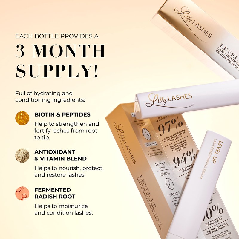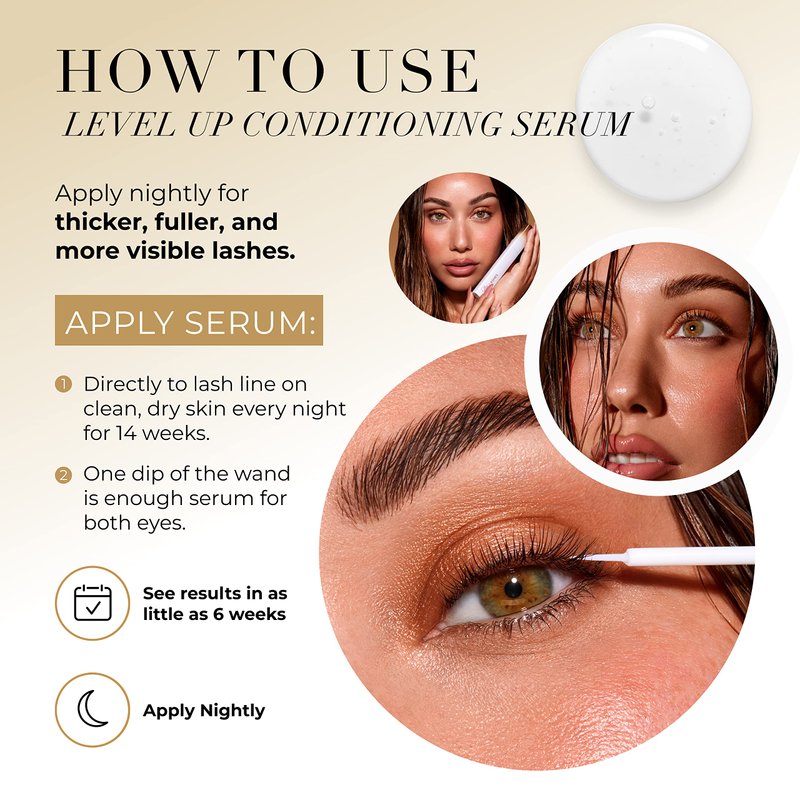- Promote Appearance of Natural Eyelash Fullness - Give your natural lashes the care they deserve with this hydrating and nourishing formula. Level Up Lash Conditioning Serum delivers results in as little as 6 weeks with optimal results achieved after 14 weeks of consistent use.