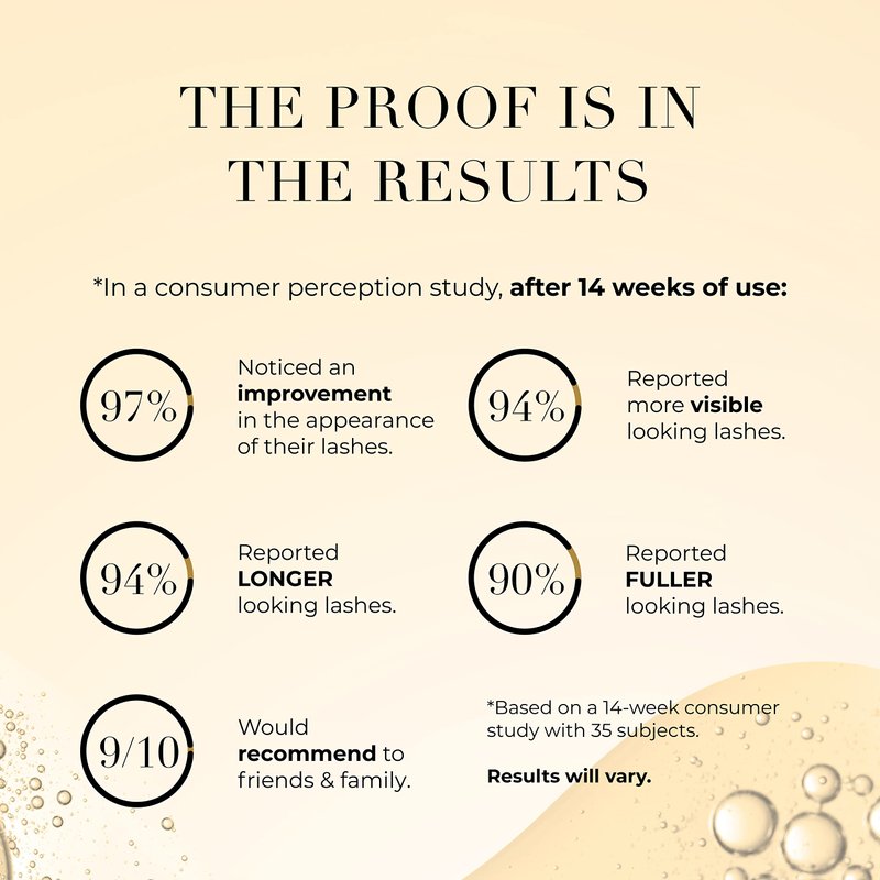 In a consumer perception study, after 14 weeks of use: 97% noticed an improvement in the appearance of their lashes, 94% reported more visible looking lashes, 94% reported LONGER looking lashes, 90% reported FULLER LOOKING lashes *Based on a 14-week consumer study with 35 subjects. Results will vary.