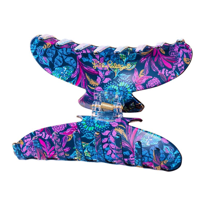 - Blue claw clip features a shiny gold Lilly Pulitzer logo on the side interior