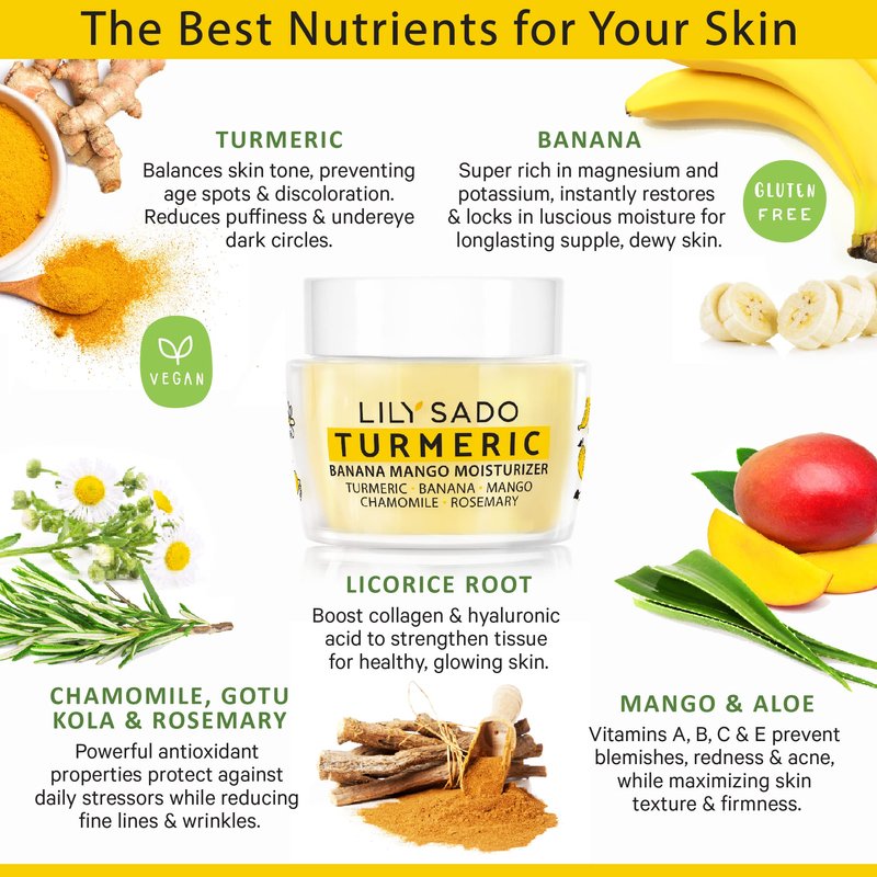 LILY SADO Turmeric Banana Mango Moisturizer is concentrated with Pure Banana Extract, Mango, Chamomile, Rosemary and other moisture-boosting botanicals to infuse your skin with luscious 12-hour hydration for a radiant, natural glow.