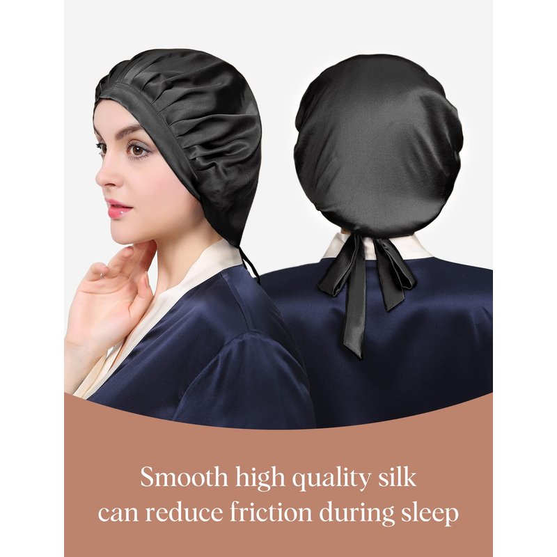 - ✅100% PURE MULBERRY SILK NIGHTCAP: Both inside and outside of this Silk Sleep Cap is made of 6A Grade 100% pure mulberry silk. Silk has lowest frictional irritation to human's skin among all kinds of fibers, Providing Comfort and Aids in Hair Regrowth. BREATHABLE silk are widely acknowledged as 'human's secondary skin' and lauded as 'Queen of fibers'. It stays on all night and light as a feather.