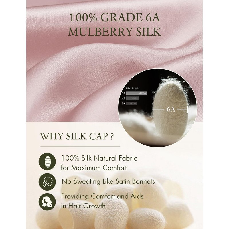 - 100% PURE MULBERRY SILK NIGHTCAP: Both inside and outside of this Silk Sleep Cap is made of 6A Grade 100% pure mulberry silk. Silk has lowest frictional irritation to human's skin among all kinds of fibers, Providing Comfort and Aids in Hair Regrowth. BREATHABLE silk are widely acknowledged as 'human's secondary skin' and lauded as 'Queen of fibers'. It stays on all night and light as a feather.