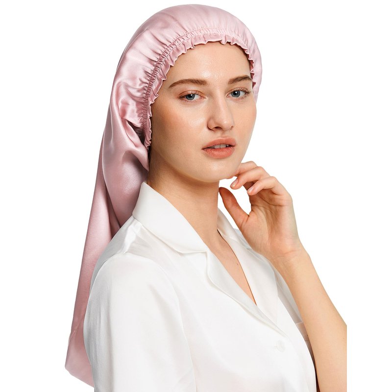 LilySilk Extra Long Silk Bonnet Sleep Cap for Women Soft Adjustable Hair Bonnet for Braids,Curly,Long Hair- Soft Elastic Band, Rosy Pink
