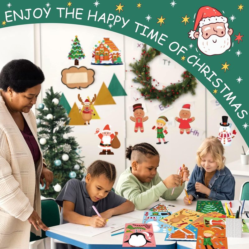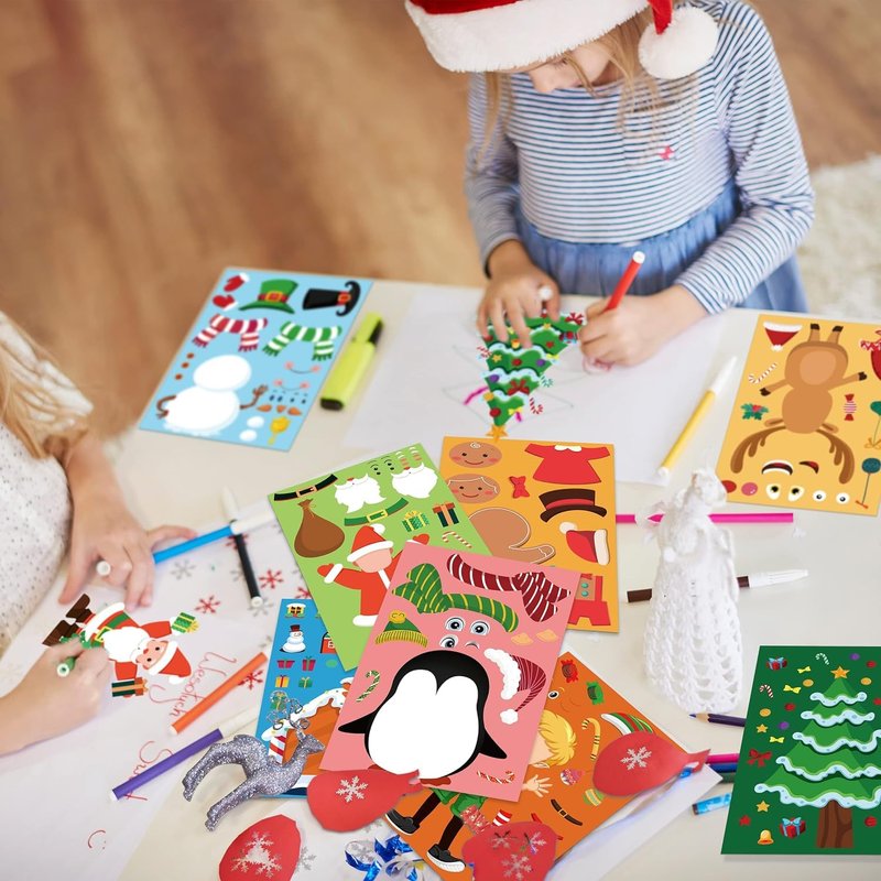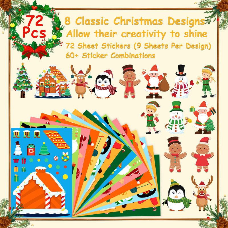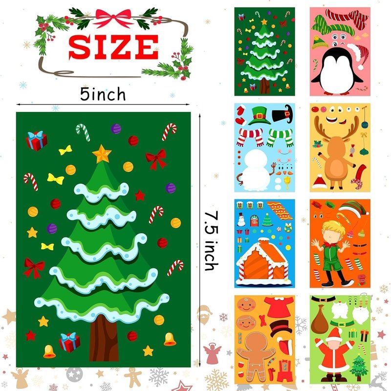 - MULTIPLE CHRISTMAS DESIGNS - LINAYE Make your own Christmas stickers package contains 32 sheets Christmas stickers which have 8 different Christmas style, 4 sheets of each style. Each sticker has different elements to choose from, and kids can paste their own Christmas Snowman, Tree, Elf, Santa according to their preferences