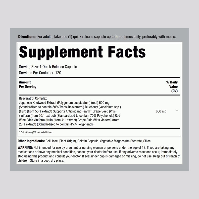 - Each capsule contains 100 mg of Resveratrol, 25 mg of Grape Seed Extract, 25 mg of Grape Skin Extract, and 25 mg of Red Wine Extract