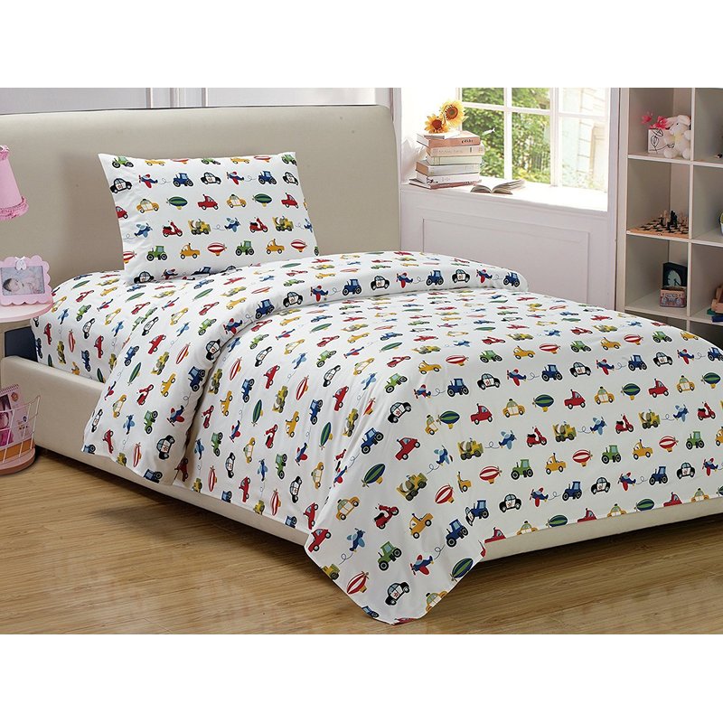 Linen Plus Sheet Set for Boys/Teens Trucks Cars Tractors Police Care Airplane Balloons White Yellow Red Green Blue Flat Sheet and Fitted Sheet and Pillow Case Twin New
