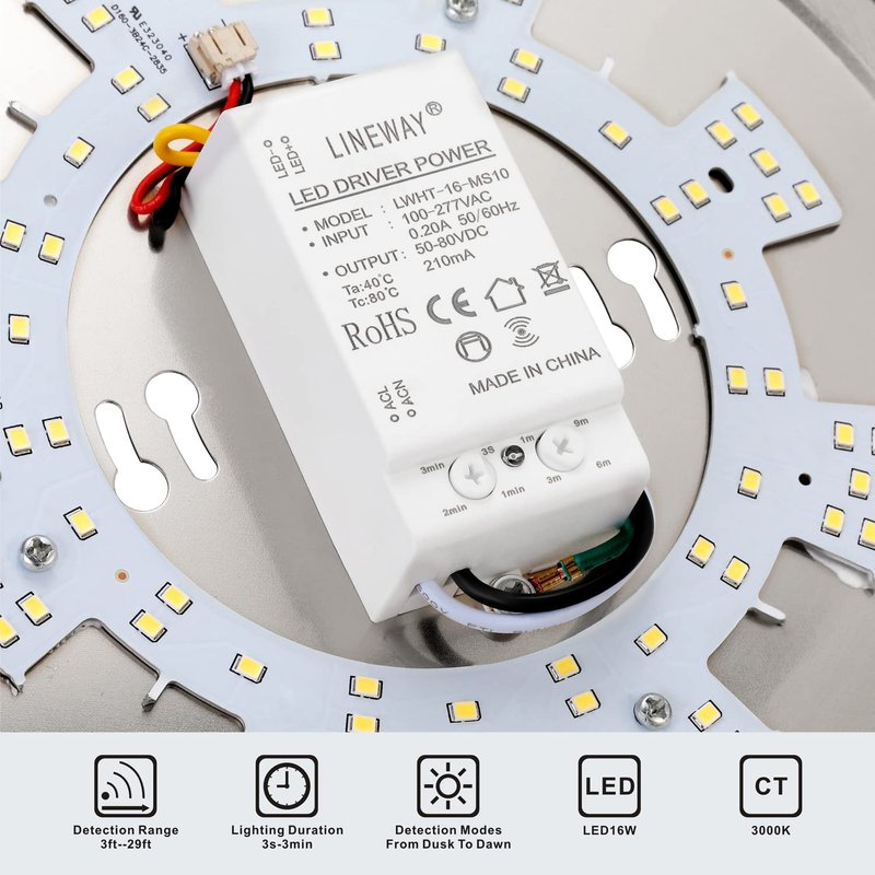 Our Lineway 10inch 16W 1600lumen 3000K motion sensor flush mount ceiling light has a cool high-quality design, bright and tasteful look, create a comfortable lighting environment, perfect for stairways hallway laundry basement warehouse shed pantries, and more.