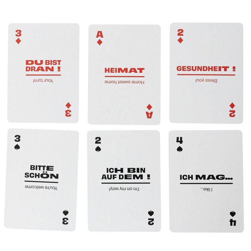 - STANDARD PLAY DECK - Each deck of cards has 54 of the most useful phrases to know in Germany, complete with phonetic pronunciations, and features a conventional deck of 52 playing cards and two jokers. These flash cards provide an introduction to common German lingo and are ideal for language learners just starting out.