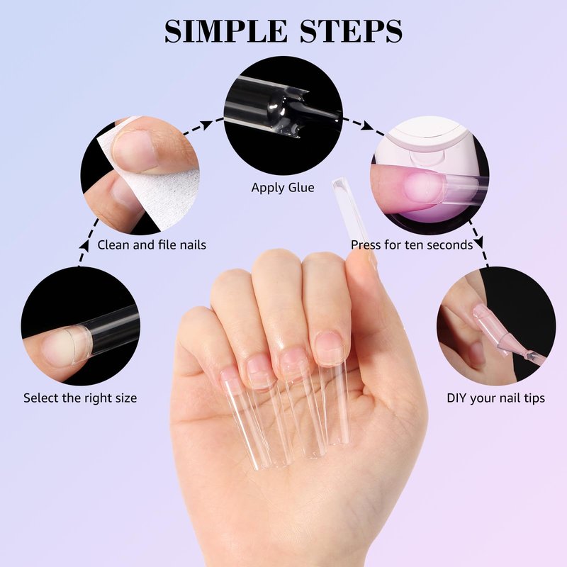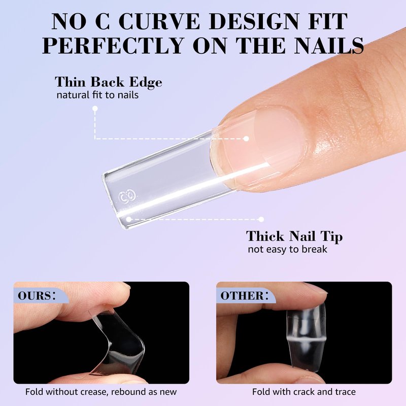 - 💝Long Square Clear Nail Tips: Get the perfect nail shape with our Long Square Nail Tips! Square nail tips bring a chic and trendy look and perfect length. The long nail tips give you more room for creativity. Apply glue and add colorful decorations, you will catch everyone's attention in every occasions with square nail tips, flaunt your unique nails charm.
