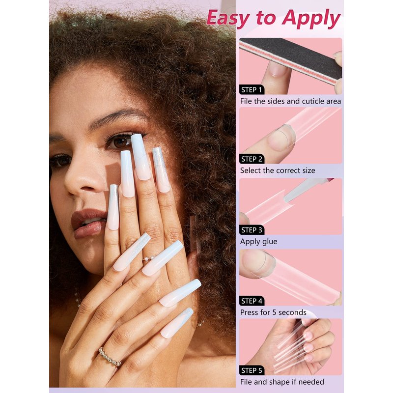 - Newest Extra Long Sizes- We improved this long nail tips not only on shape but also on sizes. The longest size is 2.17inch in length for size 0 and shortest lenght 1.85inch for size 11. It's much longer than other nail tips on the market. And there are 12 different sizes are pre-numbered 0-11 individually which that you can choose the suitable size conveniently, you also can shape it and cut the length easily according to your needs