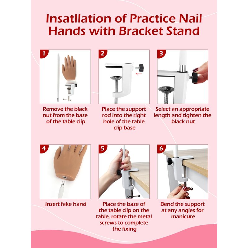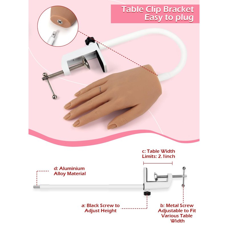 - 【Bendable Arm Bracket Table Clamp】 With white table clamp base, extendable bracket length is 16.73 inch. Training hand can be directly inserted into the bracket,don't need other procedures, easy to plug and play.The adjustable thickness of the base can clamp to most tables. Just adjust and tighten the bolts at the end of the table clamp.This stabilizes the position and angle of the prosthetic hand, greatly improve the portability of the manicure,super convenient.