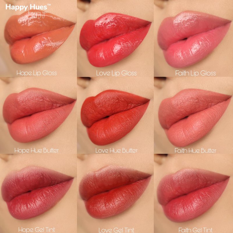 - Available in variants of: Hue Butter, Gel Tint and Lip Gloss; and shades of: Love, Faith and Hope!All lippies are infused with Vitamin E and SPF20 to protect and embrace your lips.