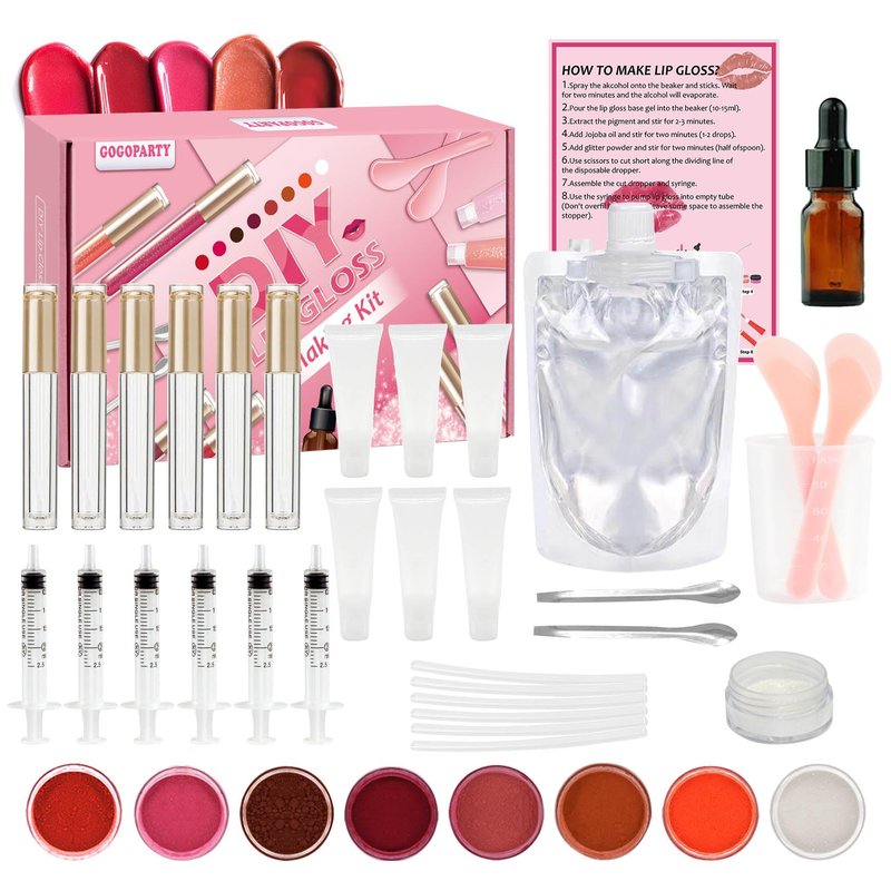 - PERFECT DIY LIP GLOSS SET: The Complete GOGOPARTY Lip Gloss Making Set includes 1x Lip Gloss Base Clear (140g), 8x Professional Lip Gloss Pigment Powder (1g), 6x Syringes, 6x Connecting Soft Tubes, 12x Empty Lip Gloss Tubes, 2x Beaker, 2x Stirring Sticks, 1x Jojoba Oil, 2x Powder Spoons, 1x Glitter Powder, 1x Instruction Manual. It meets all your lip gloss making needs.