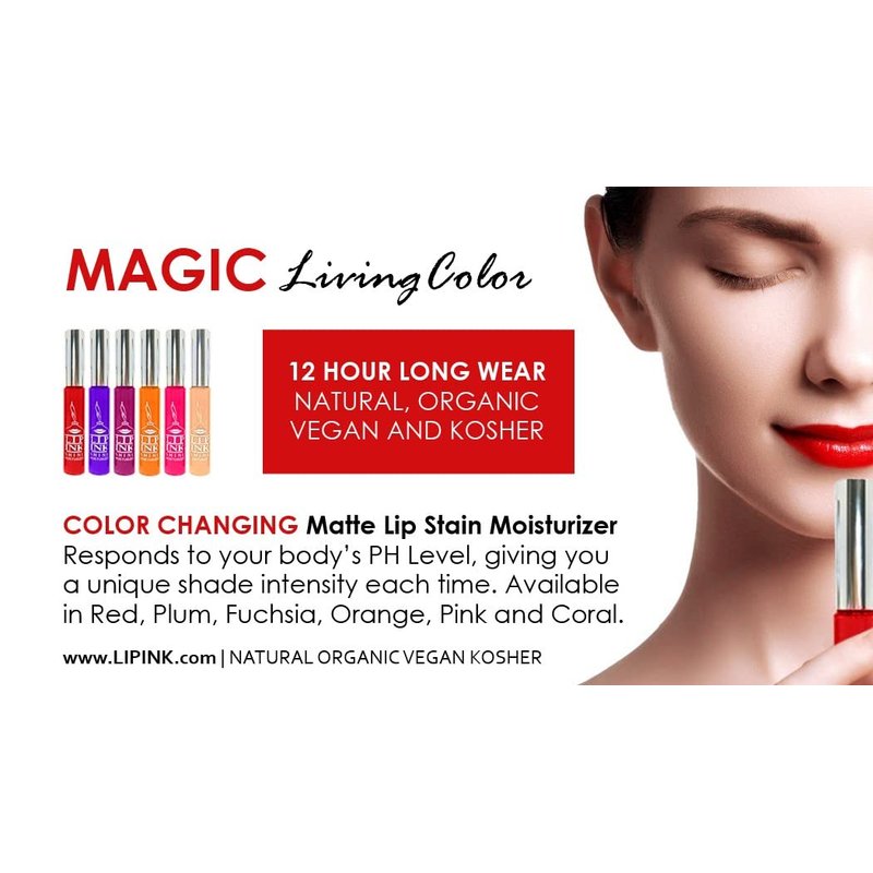 Matte vegan color lip stain moisturizer providing a vivid color with maximum hydration. When applying use sparingly, a little goes a long way, feel free to blot any excess from your lips. The color will change depending on your lip temperature and pH level, so everyone will have their own unique lip shade result. With the wand, apply a small amount LIP INK Magic Living Color Lip Stain Moisturizer into the lips until thoroughly absorbed. Once applied you can stop and enjoy the maximum hydration and with LIP INK Magic Living Color Lip Stain Moisturizer.