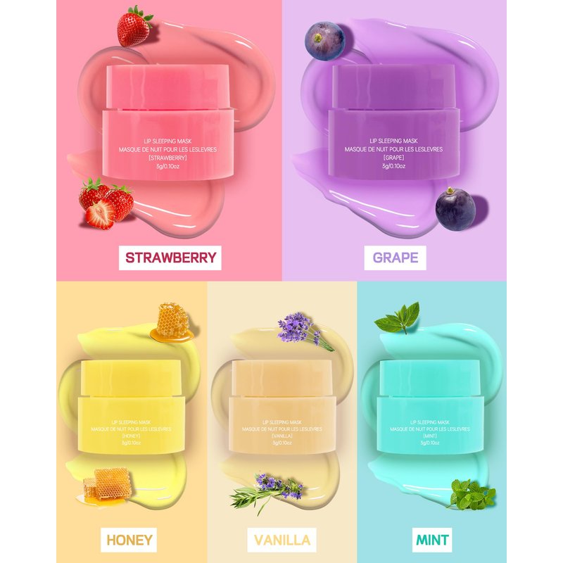 - Moisturizing Lip Sleeping Mask - The 5-pack lip sleeping mask set contains five scents: Strawberry, Mint, Grape, Honey, and Vanilla, designed for nighttime dry lip care, from moisturising and hydrating to deeply repairing and nourishing your lips! Exquisite gift box packaging design, very convenient to carry, the package comes with a lip applicator (no need to buy extra brushes). Soft texture and enticing aroma bring sweetness and lubrication to your lips.