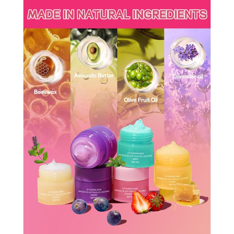 - Natural Ingredients - Our sleeping lip mask set consists of ingredients that are naturally safe, it is fortified with natural extracts such as propolis, fruit extract, vitamin E and more. The natural extracts are formulated to moisturize and protect lips and prevent dryness and cracking, hydrate and nourish the lips. Gently apply and massage lips to lock in moisture and keep lips from drying out!