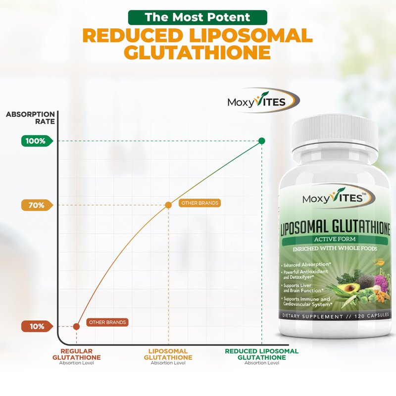 MoxyVites Liposomal Glutathione Supplement provides 500mg of pure reduced active form L-Glutathione per serving, which is the most effective for antioxidant and detoxification support. Our unique liposomal delivery system uses a phospholipid complex from organic non-GMO sunflower oil and lecithin to increase absorption and bioavailability of glutathione in the body, ensuring maximum effectiveness. In addition to glutathione, our supplement also contains a proprietary blend of organic whole foods, including avocado fruit powder, spinach leaf powder, turmeric, asparagus powder, broccoli powder, brussel sprouts powder, kale, cauliflower, and okra. These nutrient-rich foods work synergistically with glutathione to provide comprehensive antioxidant support, promote detoxification and support liver and immune health. Our Liposomal Glutathione Supplement is a powerful antioxidant and detoxifier that helps neutralize free radicals and remove harmful toxins from the body, promoting overall wellness. Each bottle provides a full 60-day supply, so you can experience the full benefits of glutathione and our organic whole food blend.