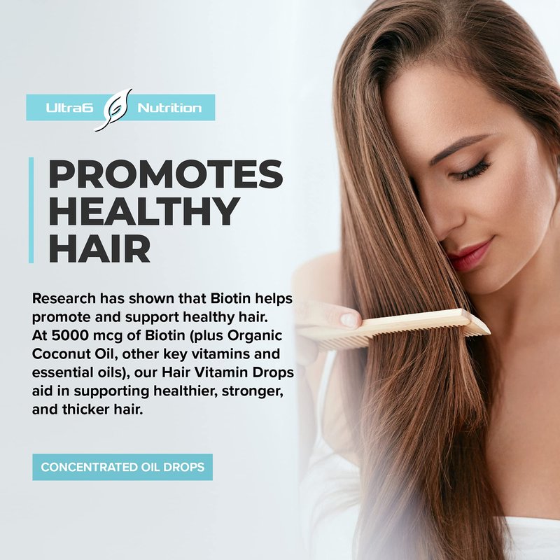- PROMOTES HEALTHY HAIR -- Research has shown that Biotin helps promote and support healthy hair. At 5000 mcg of Biotin (plus Organic Coconut Oil, other key vitamins and essential oils), our Ultra Hair Vitamin Drops aid in supporting healthier, stronger, and thicker hair.