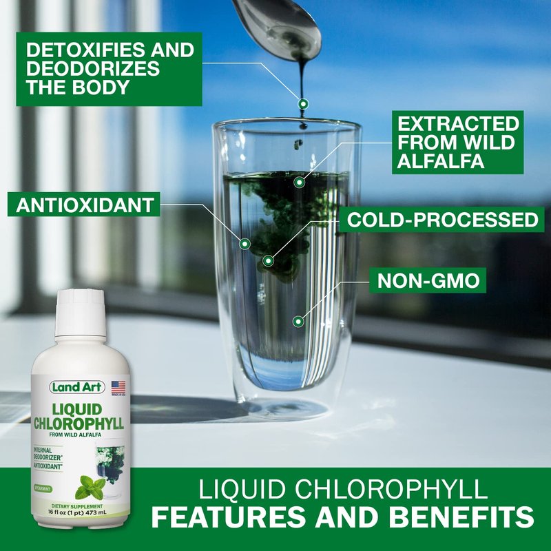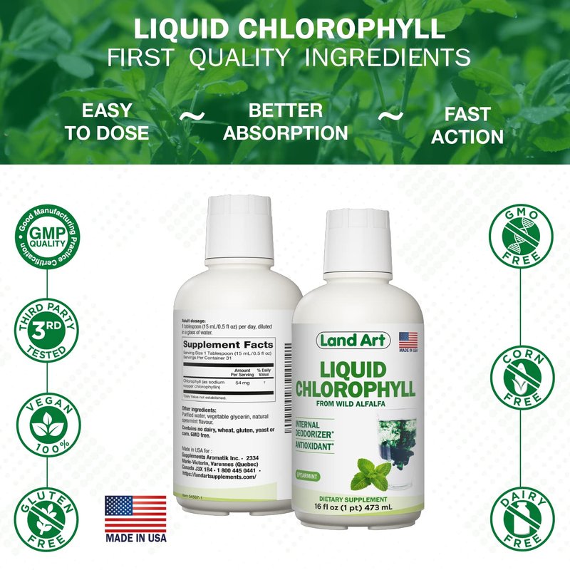 Present in plants, algae, and cyanobacteria, chlorophyll is the green pigment that gives color to tree leaves and plants. Chlorophyll is responsible for photosynthesis, a process that, from light, carbon dioxide, and water, produces sugars called carbohydrates (energy). Use our premium mint liquid Chlorophyll to neutralize unwanted body odor, bad breath and to help your body release toxins. Land Art has been the first Canadian brand on the market to sell chlorophyll. Our chlorophyll is truly unique, thanks to its supercritical extraction process and its wild non-GMO alfalfa source. The extraction is made without any chemical solvents, making it GMO-free and preservative free. Antioxidants help your body fight free radicals. Our chlorophyll does not contain parabens, dairy products, wheat, gluten, yeast or corn. It is non-pasteurized. Each dose contains 54 mg of chlorophyll per 15 ml. Diluted in a glass of water, it makes an excellent healthy drink. Once opened, please keep refrigerated. The product can be consumed until the expiry date. Land Art’s products are made in Canada, so you can feel confident using our products. During the summer months, products may arrive warm, but Amazon stores and ships products in accordance with manufacturers' recommendations, when provided. We also assure your purchase with a full refund and complete confidence regarding your expenditure. If required, please contact Amazon customer service.