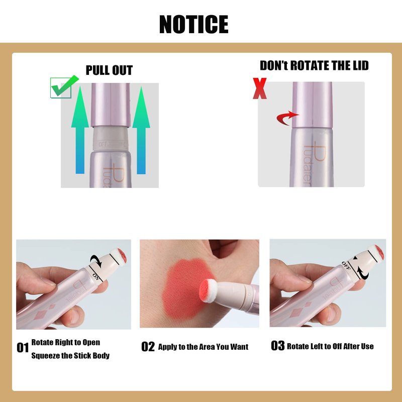 - Usage Tips: Wand design, with a cushion applicator on the top, it's convenient to carry and use. Please pull out the cap instead of twisting, or the applicator may attach to the cap. When using, just rotate the triangle area to the "on" sign, and then slightly push the tube until the paste appears, remember to rotate back to the "off" sign after use.