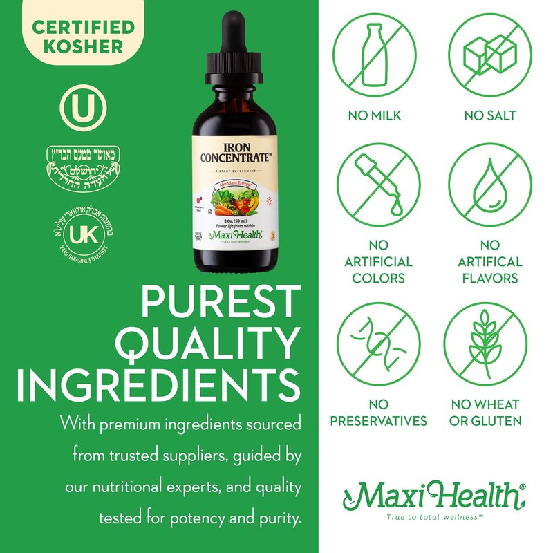 - KOSHER & VEGETARIAN INGREDIENTS - Maxi is dedicated to formulating the best iron supplements for anemia with pure and natural quality ingredients. Contains no parabens, soy, wheat, salt, gluten, milk, artificial flavors, colorings, or preservatives. Certified Kosher by the OU/UK.