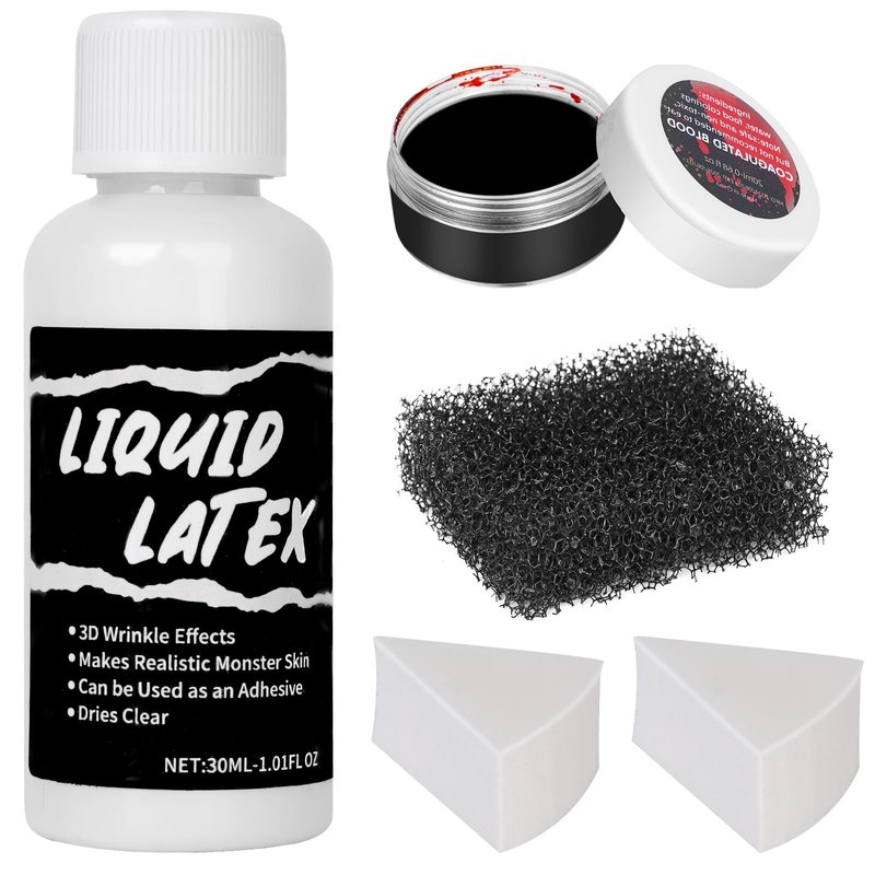 - Great Valueable Special Effects Makeup Kit:include liquid latex,,coagulated blood gel,2 kinds of sponges.A great kit for creating fake scars wounds burns or anyother realistic looks you want.Enjoy your party;