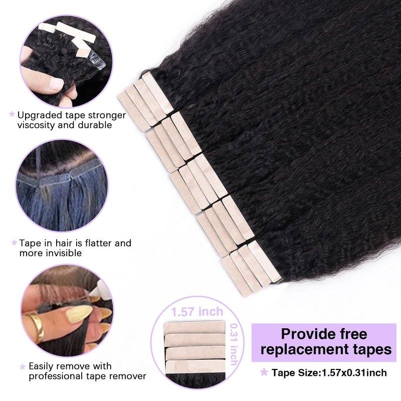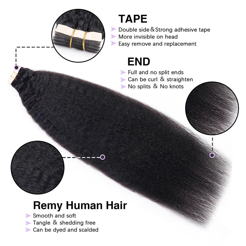 - 💎Kinky Straight Tape in Hair Extensions Material:Choose high-quality 100% remy human hair that can be dyed, permed, and styled freely. The remy hair can remain ultra-soft, shiny, silky, and tangle-free throughout its lifetime.Real human hair extensions tape ins for black women can be washed, straightened, curled,conditioned and restyled like your own hair