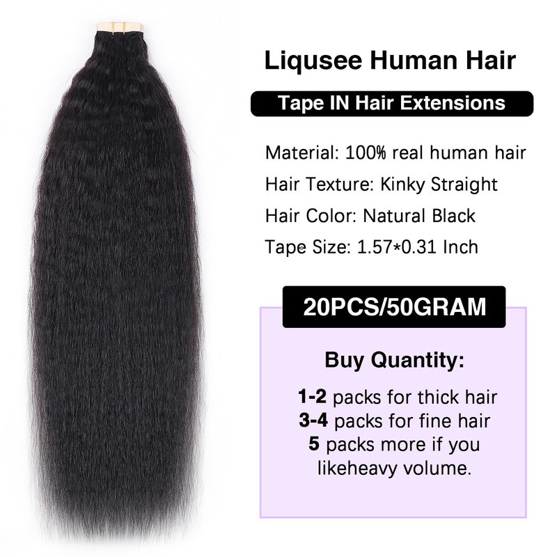 Liqusee Kinky Straight Tape In Hair Extensions Human Hair 100% Remy Hair Natural Black 18 inch 20pcs 50g/Pack Double Sided Seamless Skin Weft Tape ins Real Human Hair Extensions for Black Women