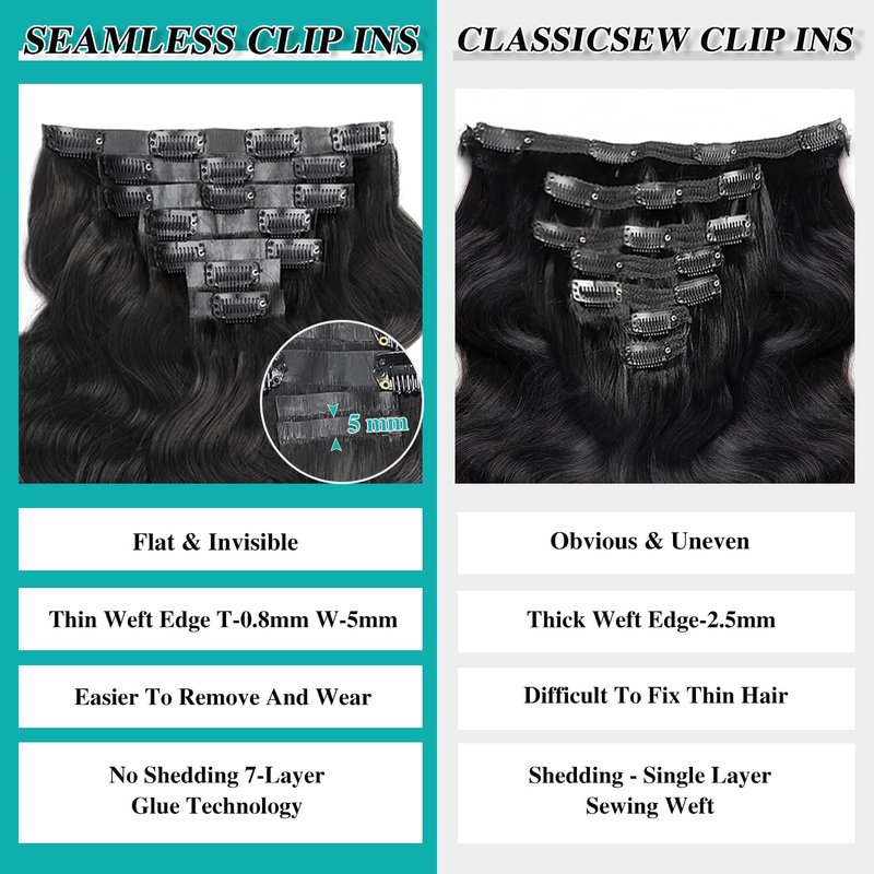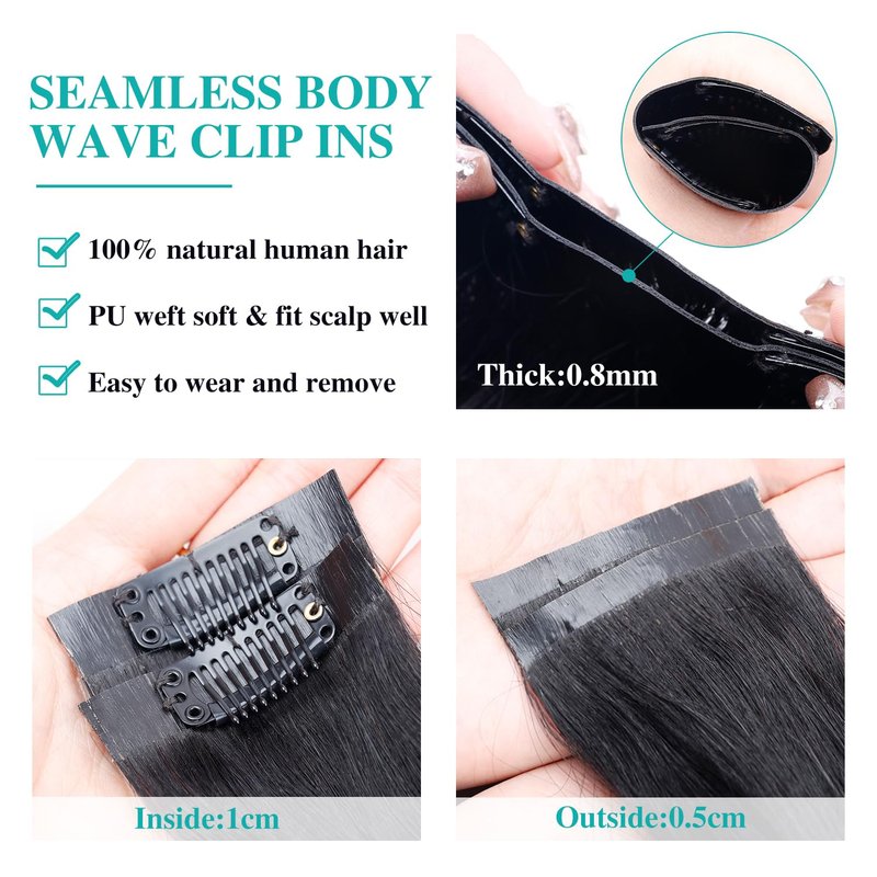 - 💎100% High Quality Real Human Hair Material: Seamless Body wave clip ins use unprocessed 10A Brazilian human hair,which is chemical free, clean, soft and natural hardly shedding and entanglement. Either the gloss or softness, it's no different from your natural hair. They blend perfectly with your hair color giving you the volume or length you're looking for.100% restore the material and touch of real hair.