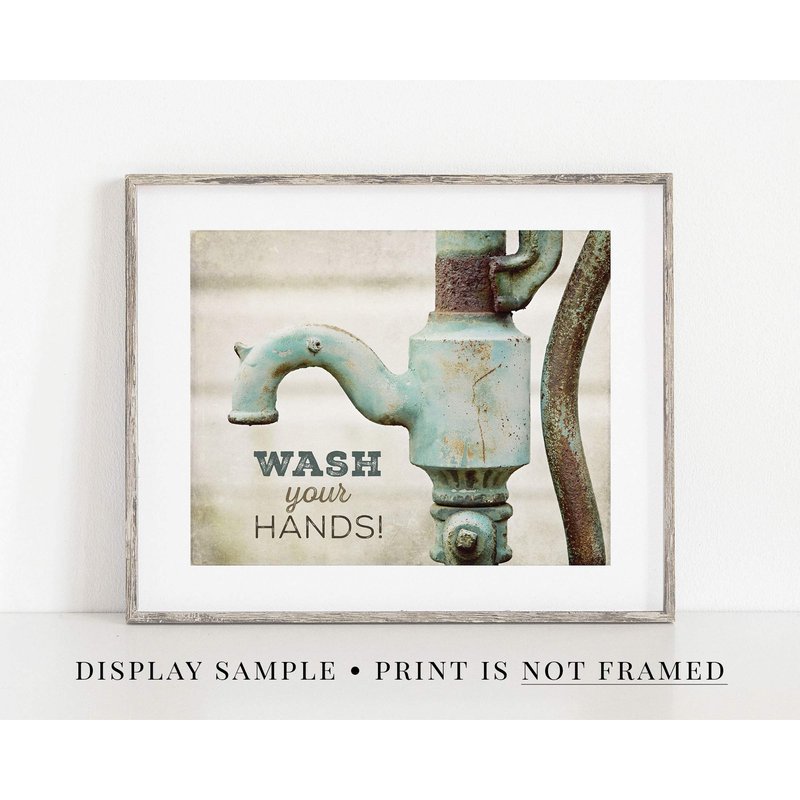 - KIDS BATHROOM ART: This Wash Your Hands print is perfect for kids' bathroom decor. The teal, beige, and rustic colors add a bit of softly-toned pop, while the funny quotation provides a bit of fun. Ideal for teaching children to make washing their hands a habit.