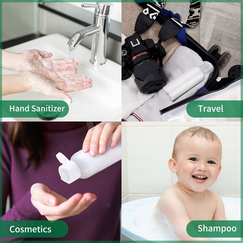 - 【PORTABLE】Flip cap dispensers are perfect for shampoo, facial toner, lotion, essential oil, makeup remover oil, and cosmetics. It is portable, you can put them in your bag or pocket and take them anywhere.