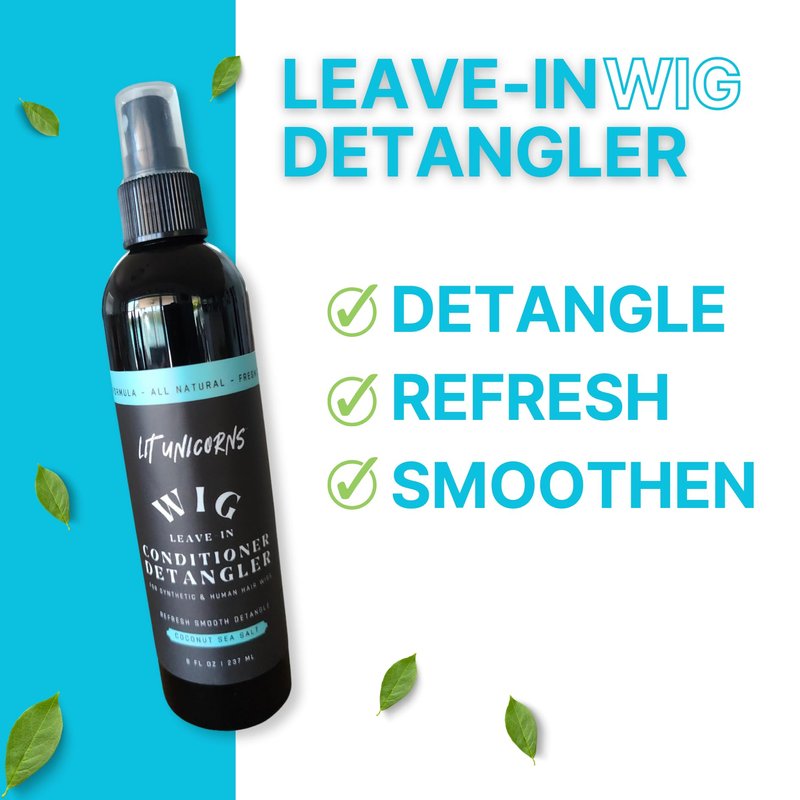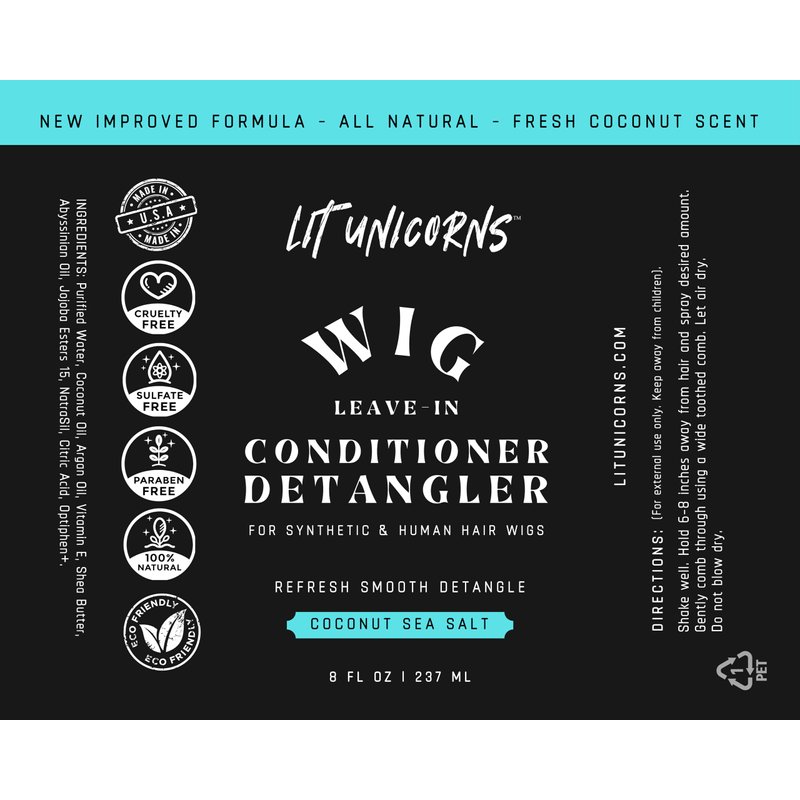 All New and improved natural formula. Lit Unicorns leave-in detangler spray with vegan silk will refresh and help detangle your synthetic or human hair wigs and extensions. Made from all natural ingredients and bottled in the USA, this wig detangler is of the highest quality. Free of Silicones (Dimethicone, etc), Parabens, Formaldehyde, Propylene glycol, Sulfates, and Synthetic fragrances that can damage your wig. Naturally gentle and refreshing. The liquid silk will leave your wig smooth without a heavy feel. Use on synthetic or human hair wigs and extensions. Fresh coconut scent essential oil (No parfumes, fragrances) . Lit Unicorns wig care products are made from high quality natural ingredients and have been a customer favorite for years. Vegan, natural and Made in the USA.