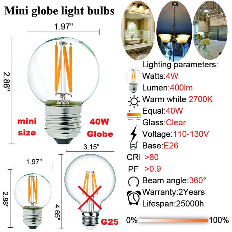 - 【LIFESPAN AND WARRANTY】: G bulb with Epistar chip,Brand filament,Brand driver and charge helium for heat dissiparation assure up to 25,000 hours with 2 year warranty,Email us via your order if you face any quality problem, replacement led bulb will be send for repalce g14 g45 g50 g15 g165 g80 g25 bulb or refund would be sent under warranty.