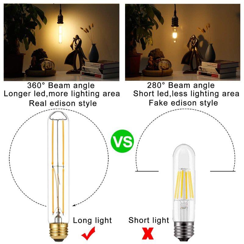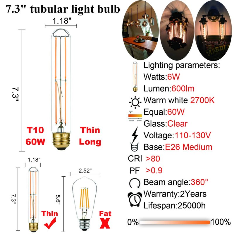 - 【SMOOTH DIMMABLE&SKINNY&LONG】:7.3Inch long E26 light bulb is smooth dimming 0%-100%,tested compatible with 95% Lutron,Leviton and Eaton dimmers,Such as Lutron Skylark,Davi,Toggler,Caseta,Maestro,Rotary Preset Dimmer,Leviton and Eaton SAL06P,etc;Narrow retro e26 edison bulb suitable for most light fixture with medium E26 socket,especially for fixtures with light bulbs in rustic Pendant,Chandeliers,Sputnik,Island,foyer,Wall scones,Vanity,Cabinet,Industrial pipe fixture,piano desk lamp,etc.