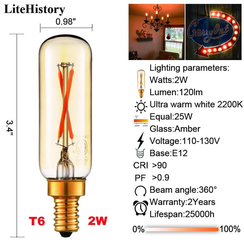 - TECHNICAL FEATURES:e12 25w candelabra bulb,AC110V-130V,2W equal to 25W e12 edison bulb,CRI>80,PF>0.9,Ultra warm white led 2200k e12 Amber,360 degree t8 led bulb,turn on instantly;with overload protection, short circuit protection and over temperature protection