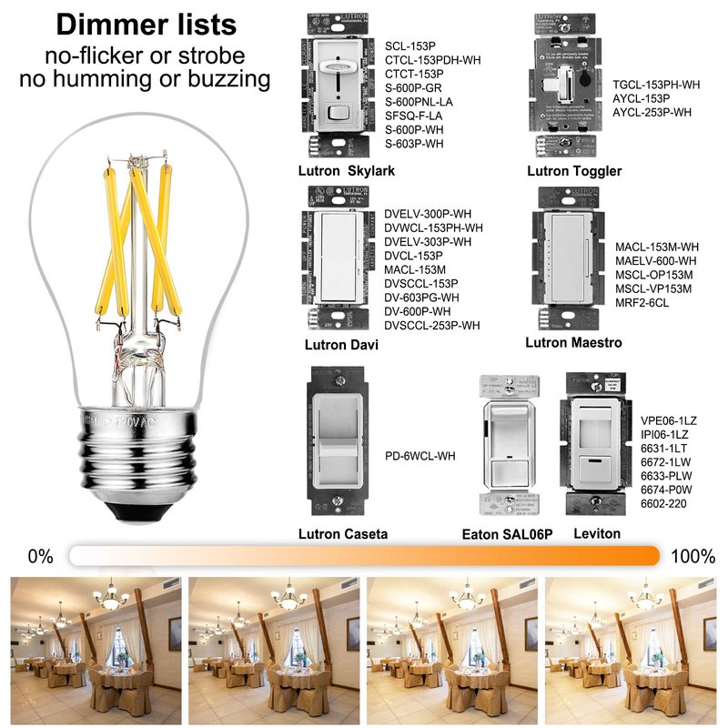 It’s smooth dimmable 0-100% for 95% Lutron and Leviton dimmers.