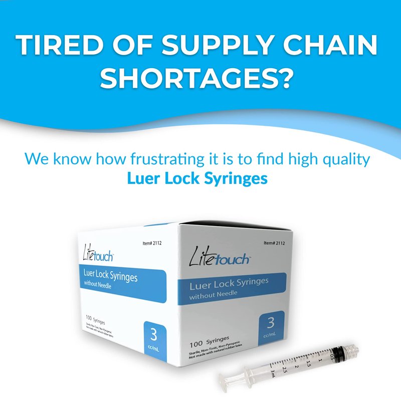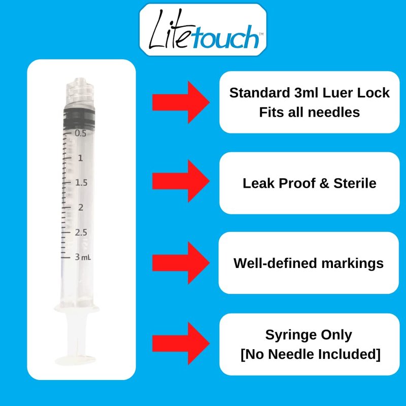 LiteTouch 3mL Luer Lock Syringe, Sterile, Individually Sealed - 100 Syringes per Box (no needle)