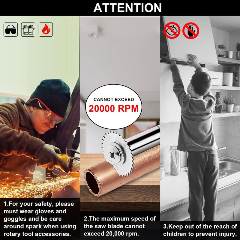 - ★【ATTENTION】For your safety, please must wear gloves and goggles and be care around spark when using rotary tool accessories.And the maximum speed of the saw blade cannot exceed 20,000 rpm.Keep out of the reach of children to prevent injury.