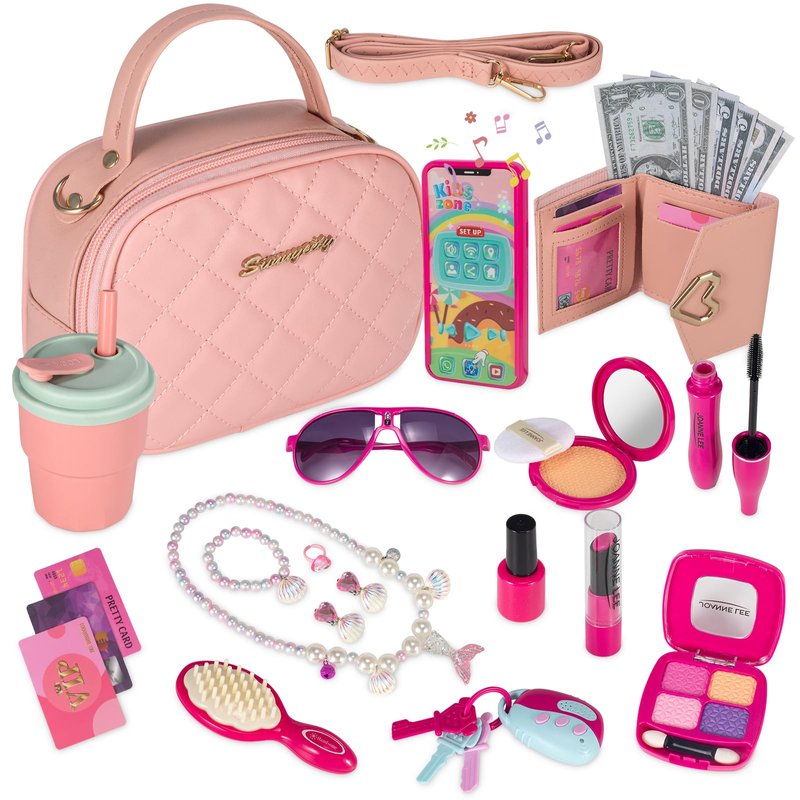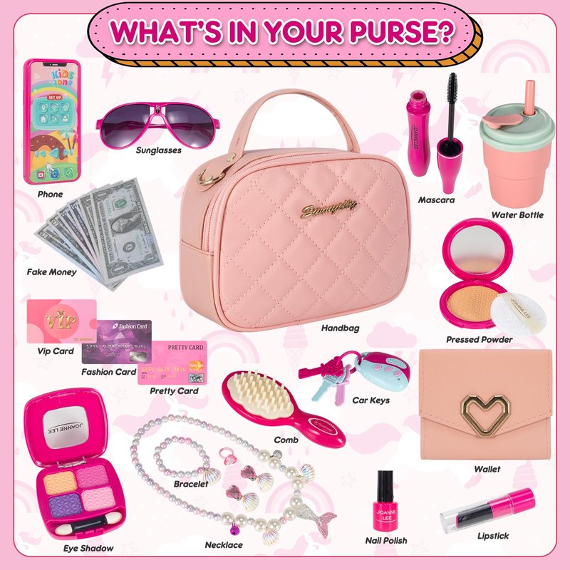 - Princess Dreams Come True! Our little girl purse set includes Pink Handbag*1, Wallet*1, Car Key with 3 keys*1, Water Bottle*1, Toy Phone*1, Sunglasses*1, Face Powder*1, Fake Money*6, Credit Card*3, Lipstick*1, Eyeshadow*1, Mascara*1, Hairbrush*1, Nail Polish*1, Mermaid Jewelry Set (Necklace, Ring, Earrings, Bracelet)--everything your little fashionista needs to step out in style.