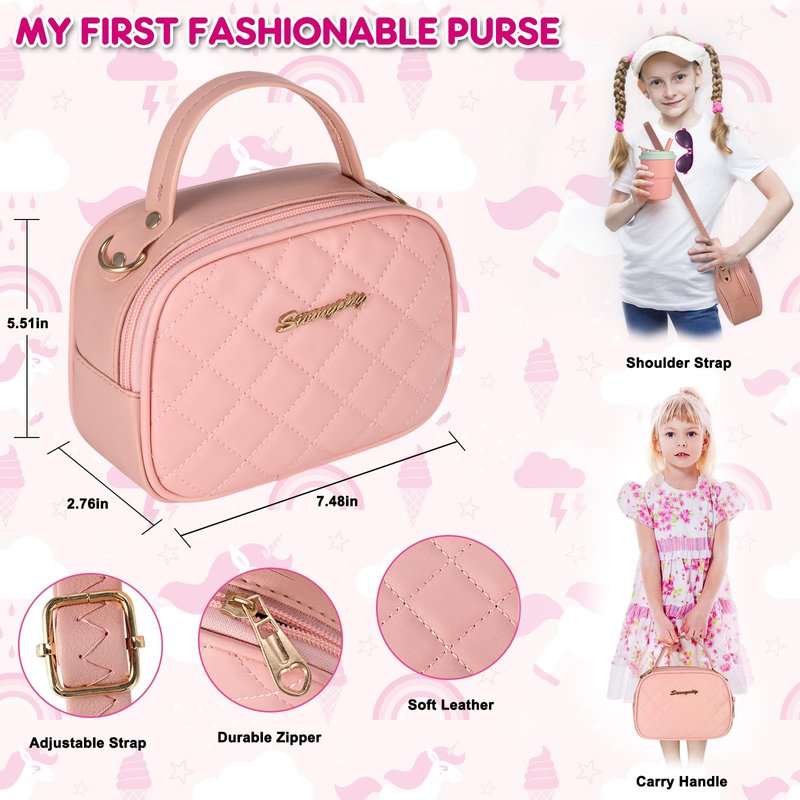 - My First Purse Toys Set: Made of soft leather, the pink handbag adorned with stylish letter, convenient carrying top handle, smooth gold zipper and a detachable length-adjustable crossbody strap. Smooth lining is not easy to deform. Cute and compact, easy to store and carry, perfect for kids to carry around and show off "My First Purse Set". Encourage your child to play pretend and use their imagination while improving cognitive skills.