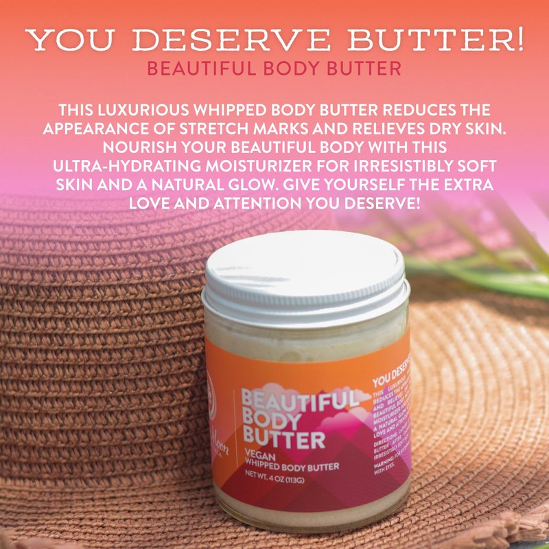 - BEAUTIFUL BODY BUTTER - This luxurious whipped body butter reduces the appearance of stretch marks and relieves dry skin. Nourish your beautiful body with this ultra-hydrating moisturizer for irresistibly soft skin and a natural glow. Give yourself the extra love and attention you deserve!
