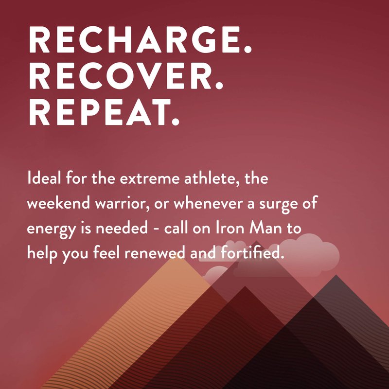 RECHARGE. RECOVER. REPEAT. Iron Man mineral bath is ideal for the extreme athlete or the weekend warrior. Use Iron Man whenever you have sore muscles or need a surge of energy, especially after competitions or hard training. Expect your muscles to feel nourished, renewed, fortified, and revitalized!