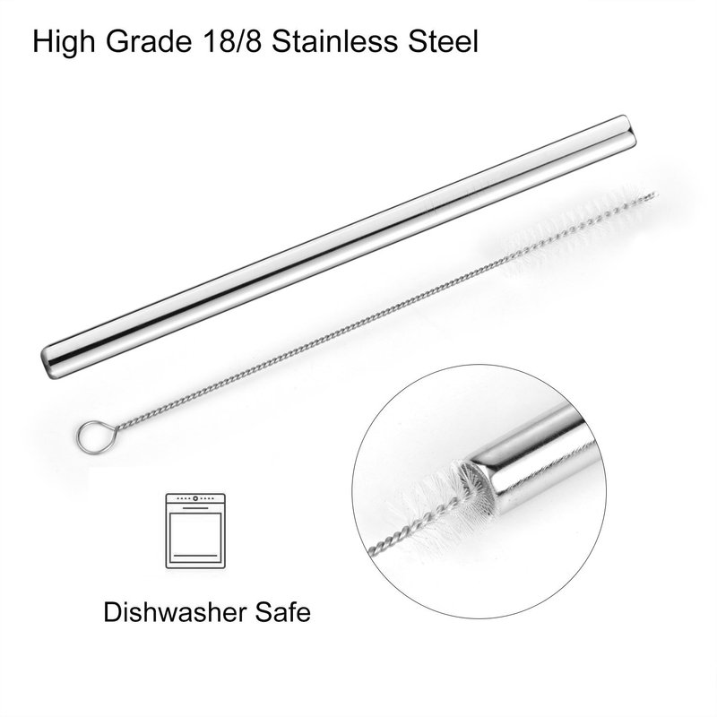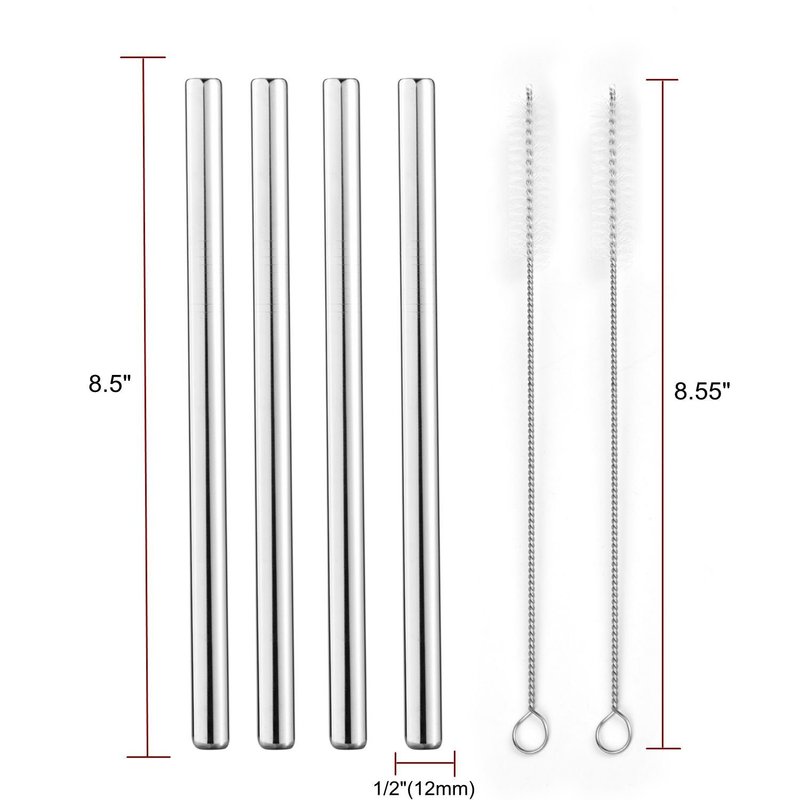 - A PACK OF REUSABLE STRAWS: Package include: 4* EXTRA WIDE (1/2" 12mm) straight stainless straws, Length: 8.5 inch for all 20ounce cups, tumblers, mugs; 2* BIG handy straw cleaning brush;1* carry pouch allows you to store or take it everywhere to instead the plastic straws given at the stores/ coffee/ smoothie shops